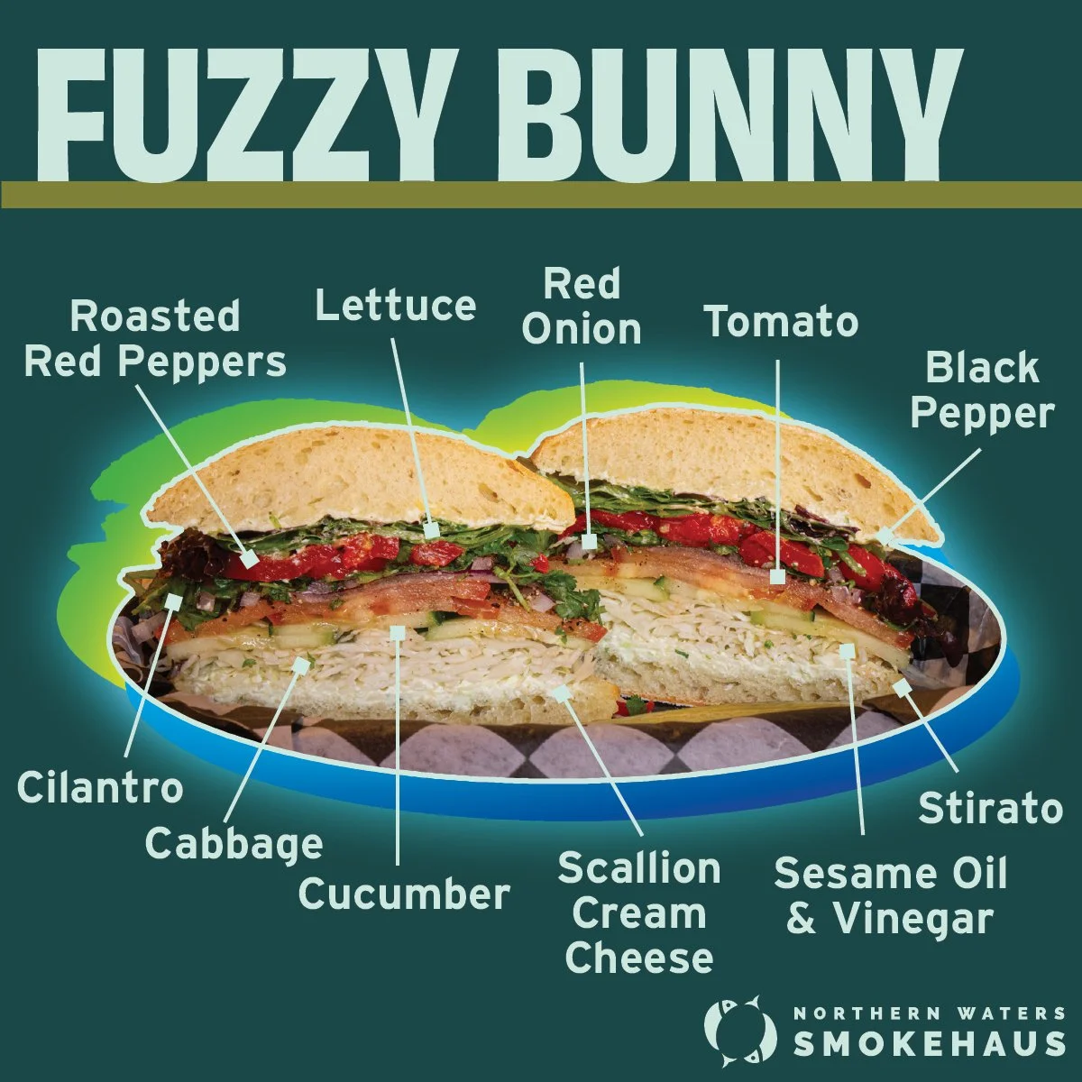 Today we feature the Fuzzy Bunny. Assembled on a (dairy- and egg-free) square stirato roll, and held together by our hausmade Scallion Cream Cheese, the Fuzzy Bunny does NOT contain smoked rabbit meat (contrary to semi-popular confusion), but DOES feature plenty of veggies: cabbage, cucumber, roasted red peppers, tomato, red onion, mixed greens, and cilantro, are carefully stacked, then dressed with crushed black pepper and sesame oil vinaigrette, completing the sandwich.