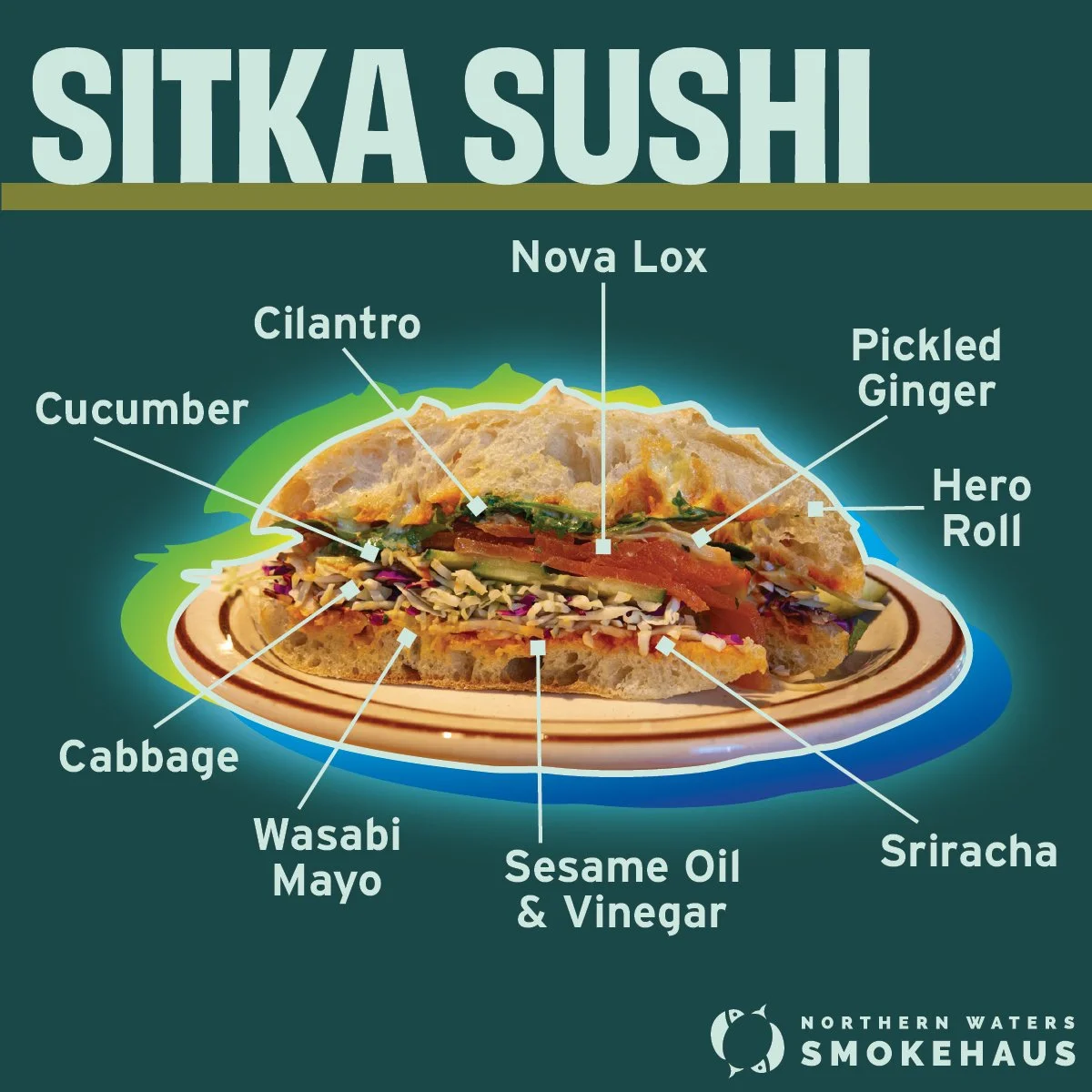 One of our earliest and still very popular sandwiches is the Sitka Sushi. Named after Sitka Alaska where Smokehaus co-owner Lynn was raised. For many years it featured our cured gravlax. Now it boasts our first ever cold-smoked, melt-in-your-mouth Nova lox (available in the deli case). Also includes pickled ginger, cilantro, cucumber, cabbage, sesame oil & vinegar, wasabi mayo, and Sriracha on a hero roll. It's one of the most perfectly balanced and refreshing sandwiches you're likely to find. A staff favorite and one we always recommend to newcomers. "The best sandwich on the menu" according to Eric, our fearless leader.